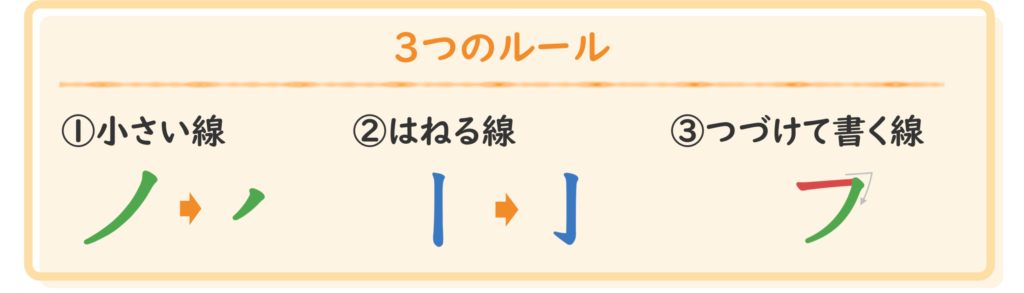 この線と書き方をおぼえると、カタカナと漢字をきれいに書けます。