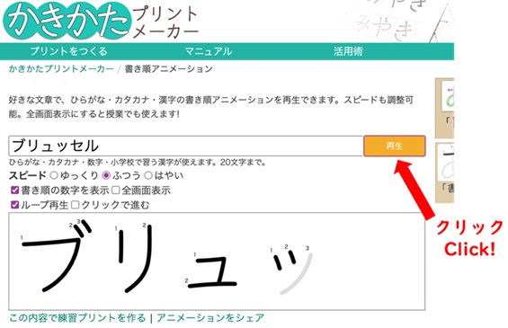 ここから別のサイト(かきかたプリントメーカー )に飛びます(許可をもらっています)。オレンジ色の「再生」ボタンを押すと、アニメーションが始まります。この動画と一緒に空書きしたり紙に書いたりして練習してみるといいでしょう。